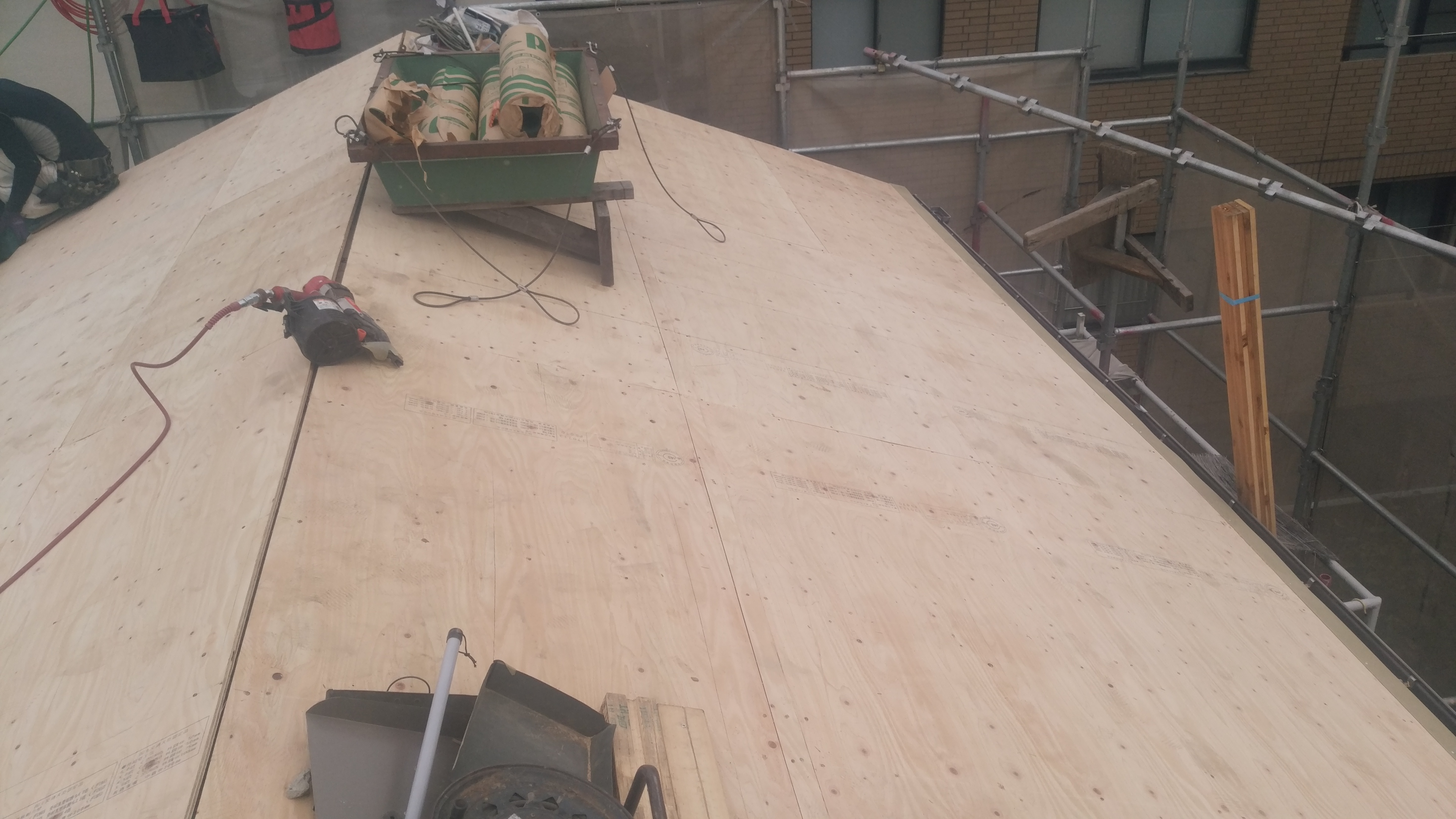 屋根葺き替えの全ての工程を、私たちが行います。予期せぬ雨などの可能性があるのに、工程ごとに業者が変わって何日もかかっていては大変なことになりかねません。瓦を降ろして、新しい下地を作り、防水のルーフィングを貼るところまでは必ず一日で終わらせることを心掛けています。